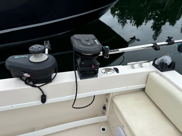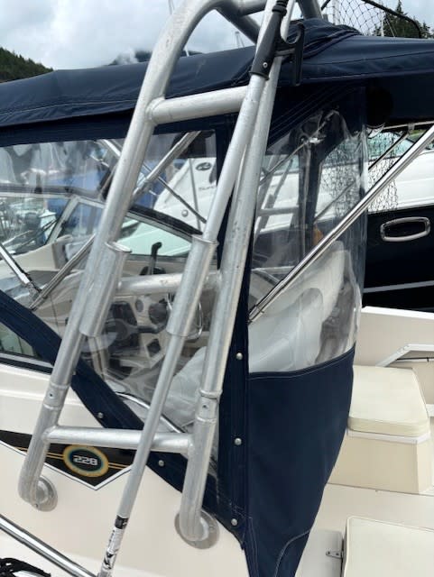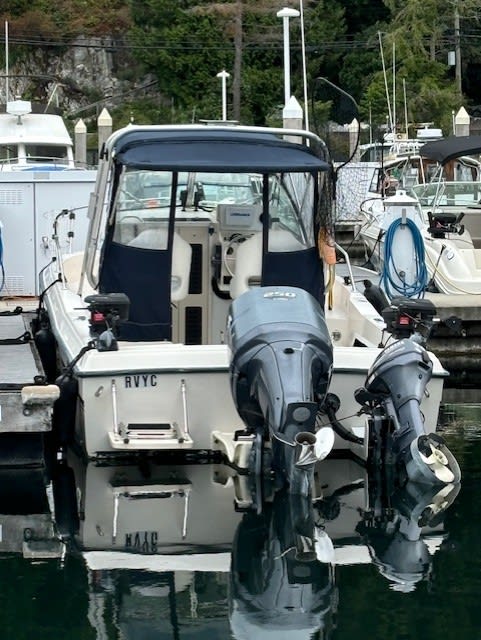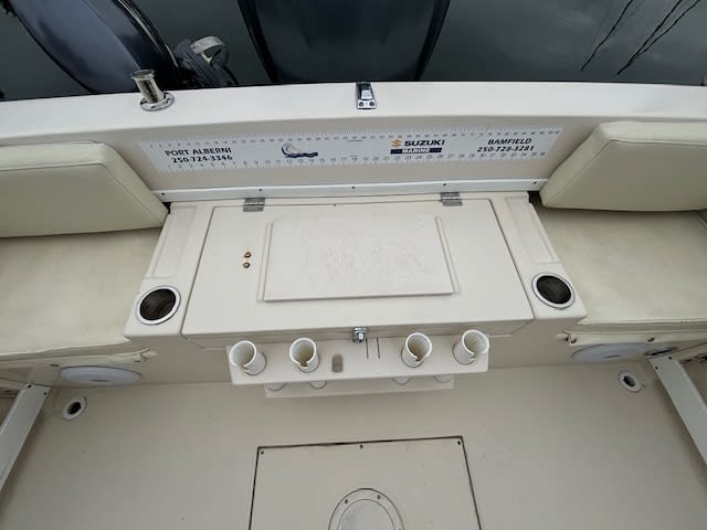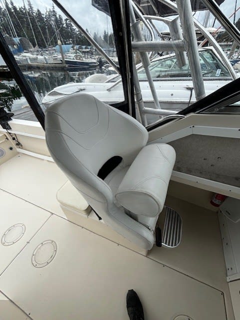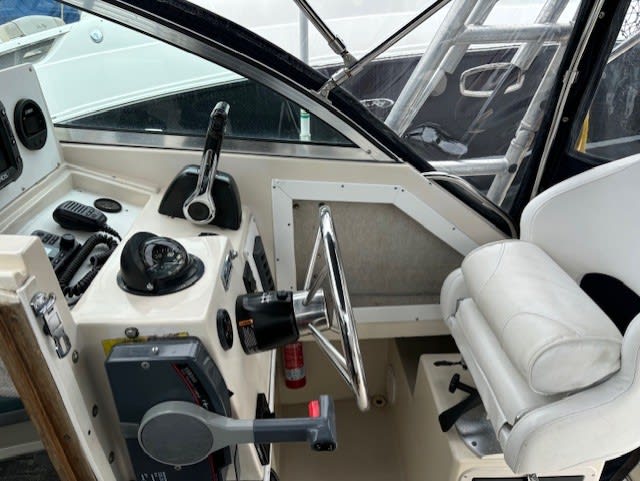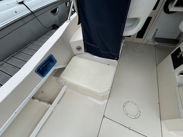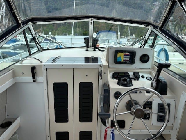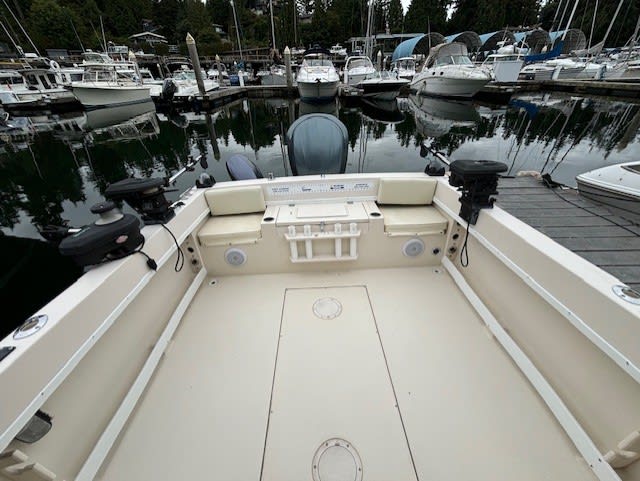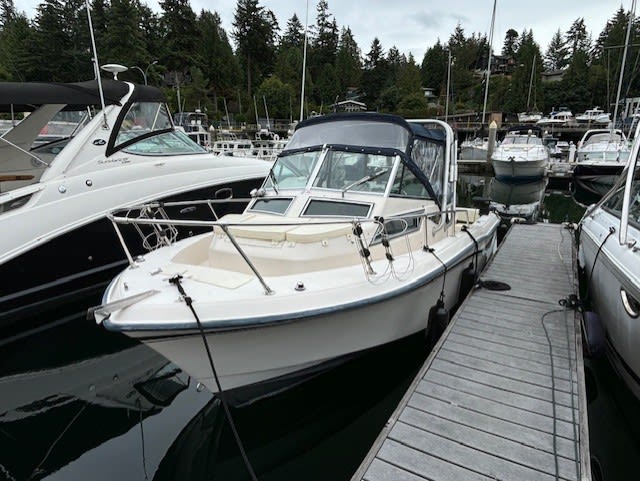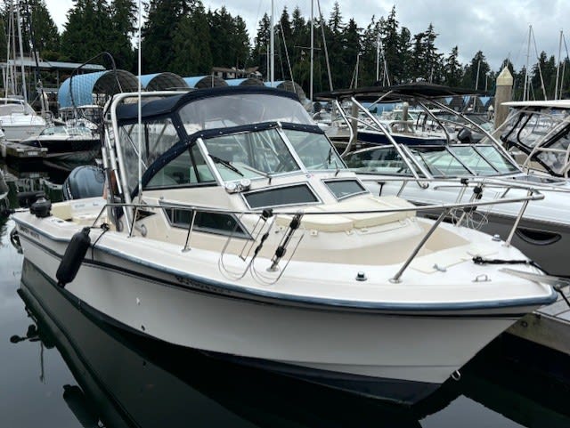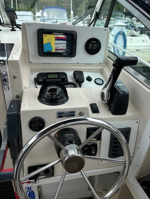 Don’t let the year of this Grady fool you , it is in remarkable condition. The gel coat, decks, hull sides upholstery and canvas all show really well. The 2007 F250 Yamaha has 993 hours, 260 are trolling hours. The 9.9 four stroke kicker is also a 2007 .Set up for fishing or commuting there are two Scotty downriggers and a Scotty pot puller, two fish holds and a bait tank, self bailing deck and washdown. If you need to sleep aboard there is a cozy V berth. Other features include: windshield wipers, defrost fans, rod holders, 2 batteries and an isolator switch, fusion sound system, trim tabs, danforth anchor with 30ft chain, 65ft rode, Garmin digital VHF radio, Lowrance GPS/fish finder. Also included is a galvanized tandem axle trailer, picture to follow. Call anytime for an appointment to view.