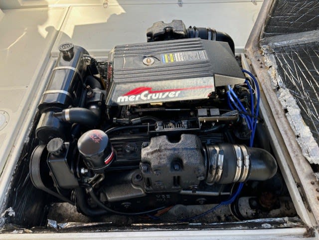Notable features include a Mercruiser 5.7L fuel-injected Vortec engine, rebuilt in 2017 with only 350 hours since overhaul, and a Bravo III outdrive. The boat also boasts a cuddy cabin with a V-berth, ideal for overnight stays, and a Garmin GPS for reliable navigation.