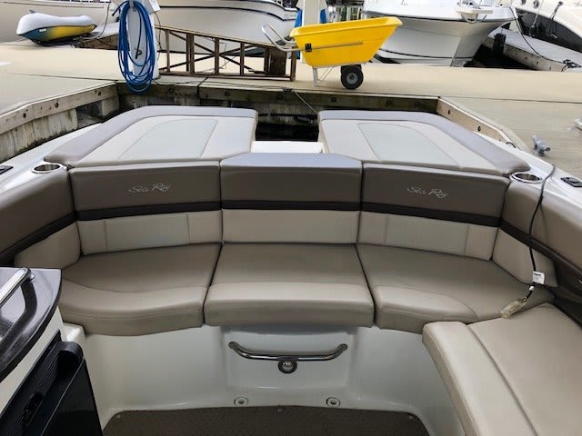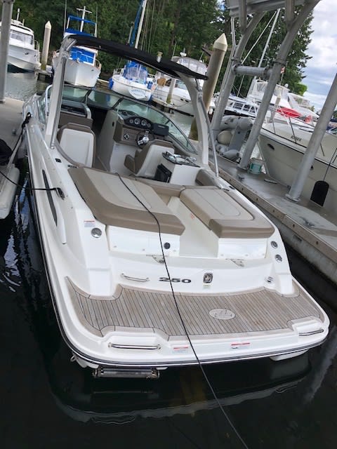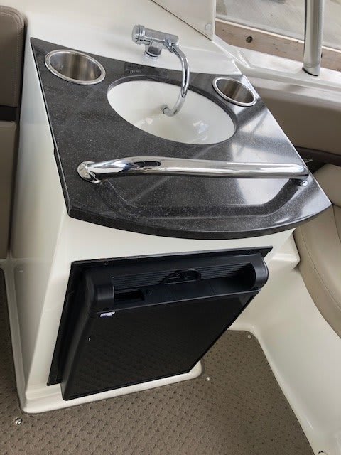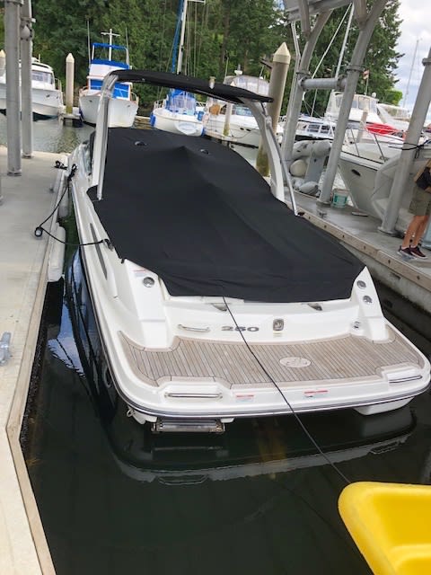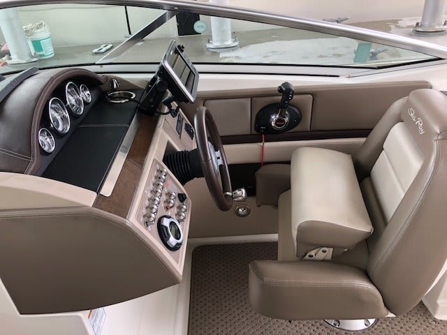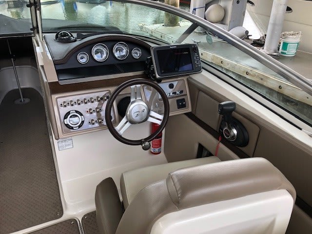 Cruise in style this summer aboard “Good JuJu”. This Sea Ray 250 SLX bowrider is a great day boat combining high quality design and performance. Climb aboard the teak swim grid with swim ladder and transom shower. Walk through the centre of a large upholstered sun pad to enter the cockpit, and find beautiful tan leather seating. Snap in carpets cover the floor and storage locker. The helm is complete with SmartCraft gauges, Raymarine navigation, trim tab controls, and Sony stereo system. A private head is enclosed on the port side for those long day cruises. Wet bar with sink and fridge completes the cockpit. A walk through windshield brings you to to bow of the boat, where there is more seating. Powered by a Mercruiser 8.2L MAG, “Good JuJu” rides like a dream. Don’t miss out. Call anytime for an appointment to view.