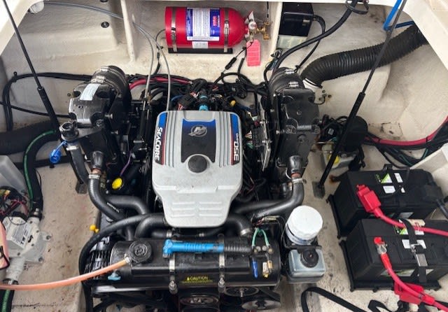 This great little cruiser sleeps up to 4 with the Vberth and mid cabin. It has a Mercury Seacore 5.7L MPI hooked up to the Seacore Bravo III duoprop leg with only 382 Hours. Ask about covered dryland moorage in Lions Bay, paid until May 20th. Features include: underwater lights, 9.9 four stroke kicker, Sea Fire suppression system, guest remote spot light, Raymarine, GPS, VHF, trim tabs, swim ladder, walkthru windshield, snap in carpets, camper top, tonneau cover, 30 amp shore power, battery charger, 2 marine batteries, Isotherm fridge, Microwave oven, single burner alc/elec stove top, courtesy lights, new stainless gas BBQ. Regularly serviced with service records back to 2014. Call anytime for more information on this well cared for Express cruiser.