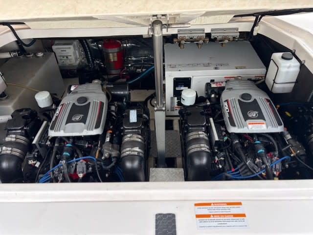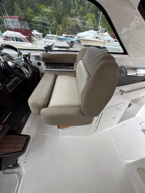 This is the luxury cruiser that you have been waiting for- ‘Taboo’ is here. This 35’ Regal Sport Coupe is a turn-key, single-level cruiser fully loaded with options. She is easy to handle and highly maneuverable with joystick control. Powered by 2 Merc 350 MAGs with 624 hours. Both the cockpit and cabin are kept bright and airy thanks to plenty of windows, skylights, and a sunroof in the hardtop. The open-concept cockpit can be heated and air conditioned and features comfortable convertible seating throughout, allowing you to transition the majority of your seating forward or aft. Other cockpit features include: transom shower, wet bar with sink and fridge, built-in grill station, removable cooler, and removable teak table. Enjoy the sunshine on the European-style multi-position sun lounge, or on upholstered lounge pads on the bow. Speakers for the Fusion stereo system are placed throughout the boat, and can be controlled from multiple control panels. Moving into the open cabin, you’ll be in awe of the amount of beautiful leather seating and space. The salon sofa converts into an additional berth. 2 TV’s will keep you entertained, and a vacuum system tucked neatly under the stairs makes cleaning a breeze. Enclosed Vacuflush head with sink and shower. The aft berth has plenty of headroom, a privacy curtain, storage, and windows. The forward berth converts into a queen. The galley features hand-crafted wood cabinetry, a stainless steel sink, 2 burner electric stove, microwave, and storage. Cockpit hardwood table, 30 amp shore power, pronautic charger, walkthru windshield, oversize pantographic wipers, remote spot light, below deck windlass with stainless claw anchor, hardwood cabin sole, huge extended swimgrid. This Regal oozes luxury inside and out. This Regal’s up-scale amenities and showy exterior will make you the envy of the marina. ‘Taboo’ will accommodate all of your cruising wants and needs. Call anytime for an appointment to view.